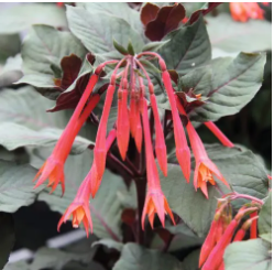 Fuchsia cul. KoralleTumeda lehestikuga, peened korallpunased õied |